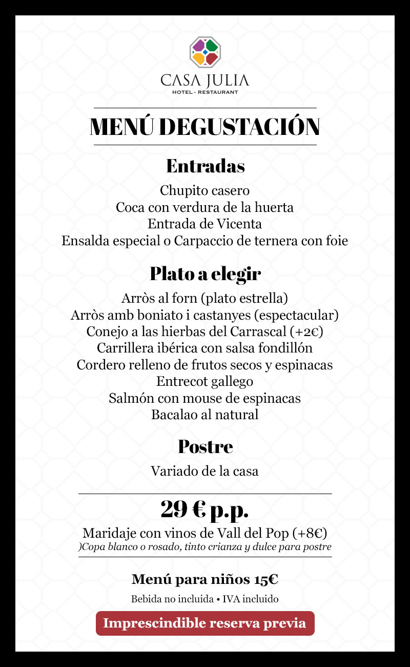Hotel Casa Julia ofrece su servicio de restaurante los jueves, viernes, sábados y domingos, de 13 h. a 16 h. solo por encargo, llamando al 966 405 050.